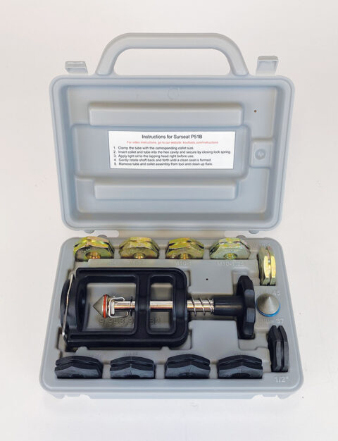 Koul Tools Sureseat P-51B Line Lapper Kit The Surseat flare lapping tool allows you to lap-in flared tubing to eliminate leaks in fuel and brake line joints. This innovative new tool removes irregularities in the flare and hones it to a perfect angle to enable the tube to seat with the fitting. The Surseat will not only perfect your newly-flared stainless steel, aluminum or copper lines, it can also repair the seal with the fitting of an existing brake or fuel line. It is based on the tried and true practice of lapping engine valves. A diamond dust coated lapping head with a precision 37 and 45 degree angle literally polishes the flare smooth to perfection. The Surseat is a valuable asset for car builders, automotive repair facilities, and hobbyists.
